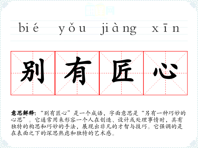 “别有匠心”是一个成语,字面意思是“另有一种巧妙的心思”。它通常用来形容一个人在创造、设计或处理事情时,具有独特的构思和巧妙的手法,展现出非凡的才智与技巧。它强调的是在表面之下的深思熟虑和独特的艺术感。