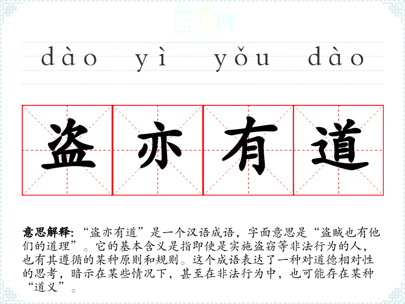 “盗亦有道”是一个汉语成语,字面意思是“盗贼也有他们的道理”。它的基本含义是指即使是实施盗窃等非法行为的人,也有其遵循的某种原则和规则。这个成语表达了一种对道德相对性的思考,暗示在某些情况下,甚至在非法行为中,也可能存在某种“道义”。