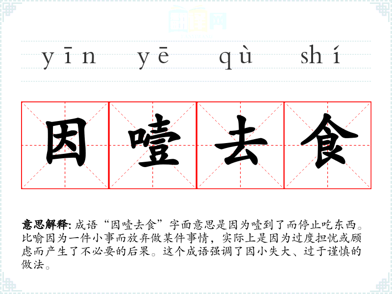 成语“因噎去食”字面意思是因为噎到了而停止吃东西。比喻因为一件小事而放弃做某件事情,实际上是因为过度担忧或顾虑而产生了不必要的后果。这个成语强调了因小失大、过于谨慎的做法。