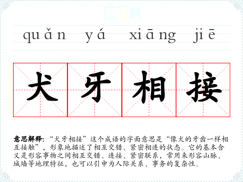 “犬牙相接”这个成语的字面意思是“像犬的牙齿一样相互接触”,形象地描述了相互交错、紧密相连的状态。它的基本含义是形容事物之间相互交错、连接、紧密联系,常用来形容山脉、城墙等地理特征,也可以引申为人际关系、事务的复杂性。
