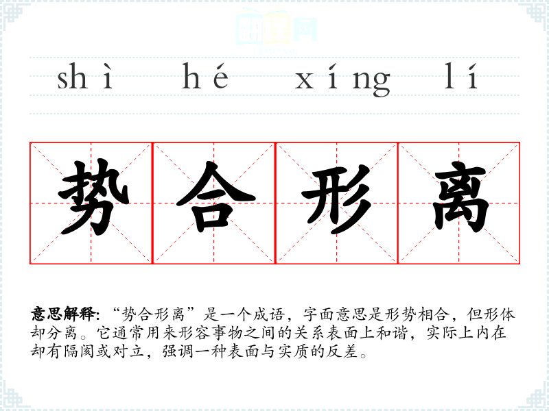 “势合形离”是一个成语,字面意思是形势相合,但形体却分离。它通常用来形容事物之间的关系表面上和谐,实际上内在却有隔阂或对立,强调一种表面与实质的反差。