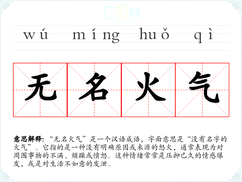 “无名火气”是一个汉语成语,字面意思是“没有名字的火气”。它指的是一种没有明确原因或来源的怒火,通常表现为对周围事物的不满、烦躁或愤怒。这种情绪常常是压抑已久的情感爆发,或是对生活不如意的发泄。