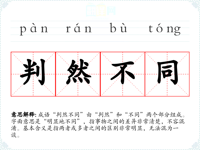 成语“判然不同”由“判然”和“不同”两个部分组成。字面意思是“明显地不同”,指事物之间的差异非常清楚,不容混淆。基本含义是指两者或多者之间的区别非常明显,无法混为一谈。