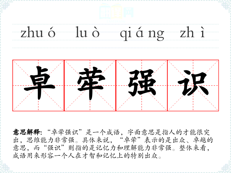 “卓荦强识”是一个成语,字面意思是指人的才能很突出,思维能力非常强。具体来说,“卓荦”表示的是出众、卓越的意思,而“强识”则指的是记忆力和理解能力非常强。整体来看,成语用来形容一个人在才智和记忆上的特别出众。