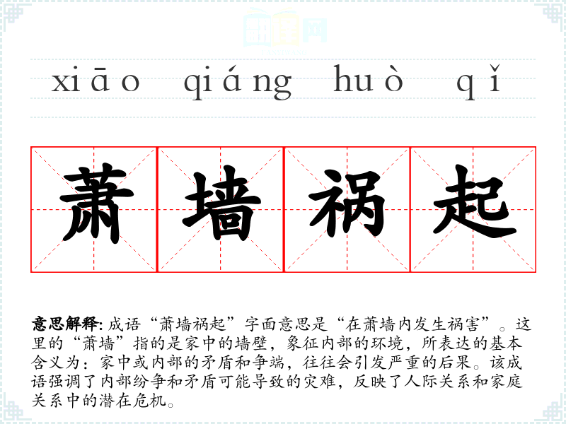 在英语中,可以用“trouble within”或“internal conflict”来表达类似的意思,但没有直接对应的成语。这反映出不同文化对家庭和组织内部和谐的重视程度可能有所不同。