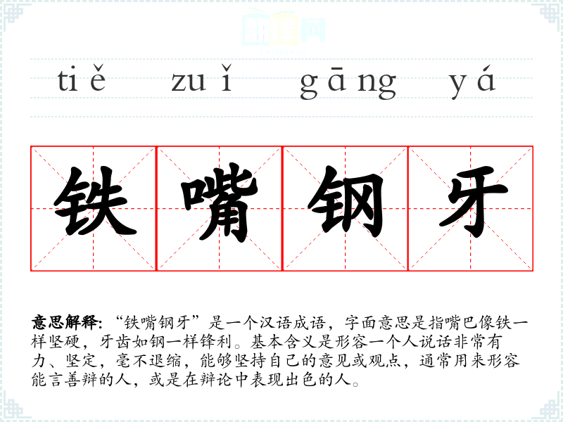 “铁嘴钢牙”是一个汉语成语,字面意思是指嘴巴像铁一样坚硬,牙齿如钢一样锋利。基本含义是形容一个人说话非常有力、坚定,毫不退缩,能够坚持自己的意见或观点,通常用来形容能言善辩的人,或是在辩论中表现出色的人。