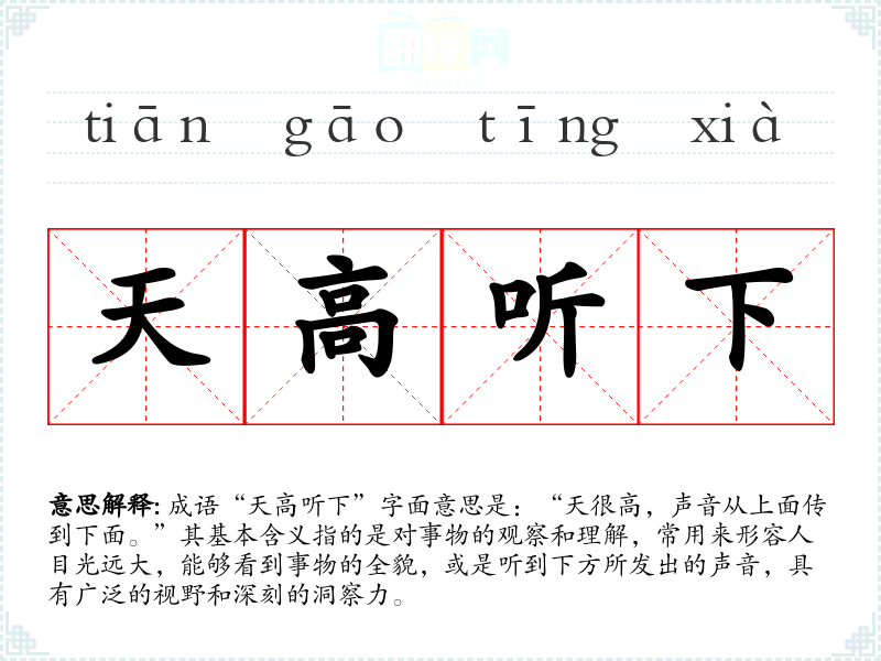 “天高听下”并没有广泛的历史背景或特定典故,它的构成和意义更多是通过字面理解而得出。在古代文学中,类似的表达常用于描述人的洞察力和理解力,但具体的出处较为模糊,可能在不同的文本中出现过相似的表述。