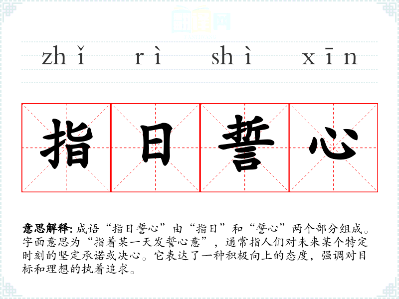 成语“指日誓心”由“指日”和“誓心”两个部分组成。字面意思为“指着某一天发誓心意”,通常指人们对未来某个特定时刻的坚定承诺或决心。它表达了一种积极向上的态度,强调对目标和理想的执着追求。