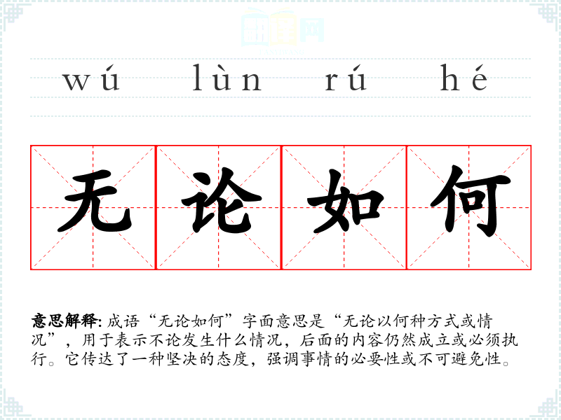 成语“无论如何”字面意思是“无论以何种方式或情况”,用于表示不论发生什么情况,后面的内容仍然成立或必须执行。它传达了一种坚决的态度,强调事情的必要性或不可避免性。