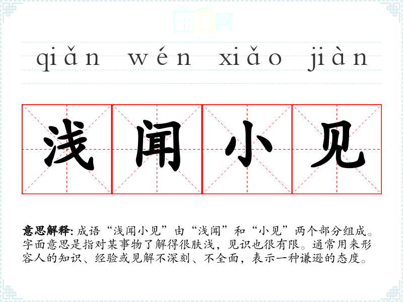 成语“浅闻小见”由“浅闻”和“小见”两个部分组成。字面意思是指对某事物了解得很肤浅,见识也很有限。通常用来形容人的知识、经验或见解不深刻、不全面,表示一种谦逊的态度。