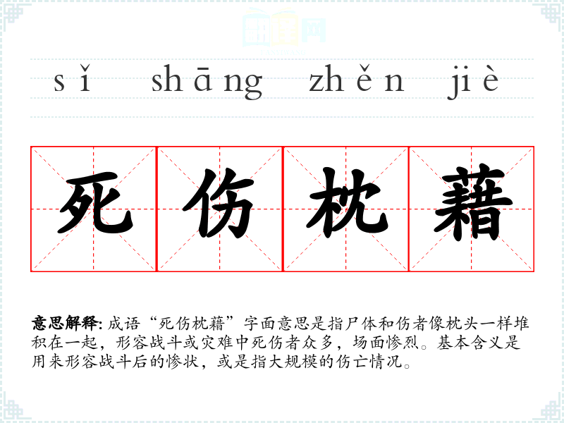 - 反义成语:平安无事、安然无恙。前者强调没有伤亡,后者则强调安全健康,反映出与“死伤枕藉”完全相反的状态。