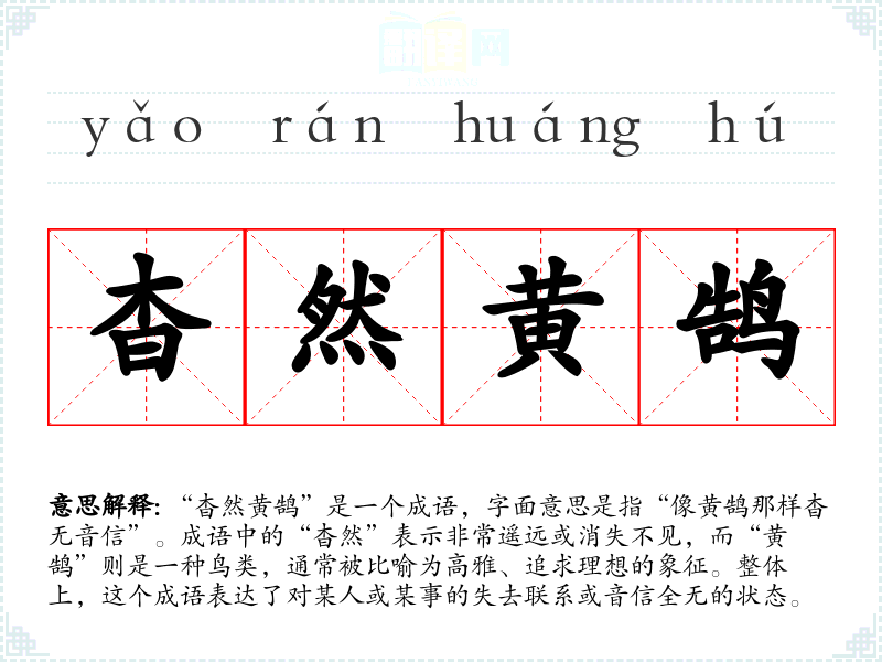 - 反义成语:有声有色、鲜明可见。它们表示信息清晰可见,与“杳然黄鹄”的含义相对。