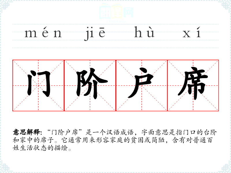 这个成语的具体出处并不明确,但可以推测它源自于古代文人对民生的关注。历史上,**的文人常常在诗歌、散文中描写普通人的生活状态,门阶和席子作为家庭生活的基本象征,能够反映出一个家庭的经济状况和生活水平。