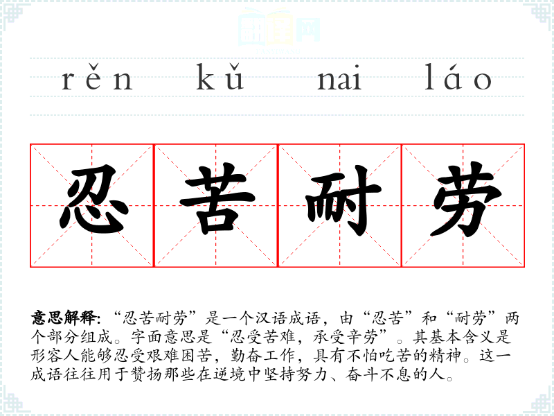 “忍苦耐劳”是一个汉语成语,由“忍苦”和“耐劳”两个部分组成。字面意思是“忍受苦难,承受辛劳”。其基本含义是形容人能够忍受艰难困苦,勤奋工作,具有不怕吃苦的精神。这一成语往往用于赞扬那些在逆境中坚持努力、奋斗不息的人。