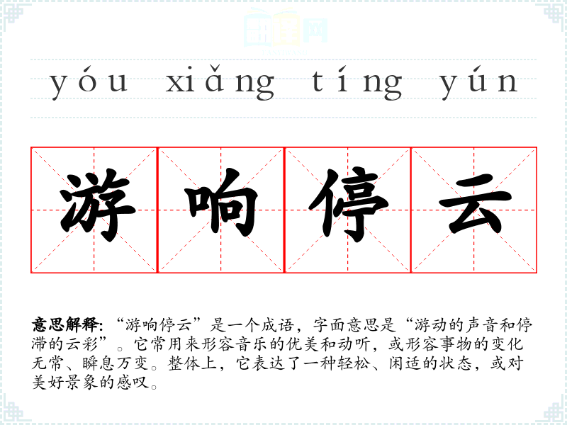 “游响停云”是一个成语,字面意思是“游动的声音和停滞的云彩”。它常用来形容音乐的优美和动听,或形容事物的变化无常、瞬息万变。整体上,它表达了一种轻松、闲适的状态,或对美好景象的感叹。