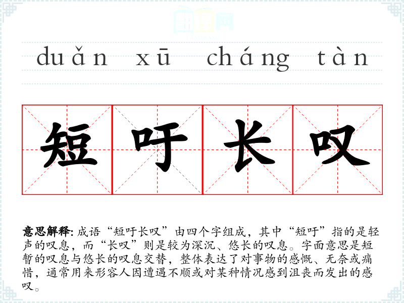 成语“短吁长叹”由四个字组成,其中“短吁”指的是轻声的叹息,而“长叹”则是较为深沉、悠长的叹息。字面意思是短暂的叹息与悠长的叹息交替,整体表达了对事物的感慨、无奈或痛惜,通常用来形容人因遭遇不顺或对某种情况感到沮丧而发出的感叹。
