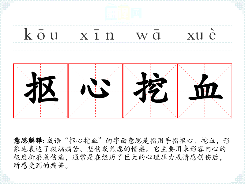 “抠心挖血”并没有明确的历史典故来源,但其构成的字面意象在汉语中常用于描绘极端的情感状态。该成语的使用可能是受到古代文学作品中对痛苦和悲伤的描写影响,尤其是古典诗词中对情感的细腻刻画。
