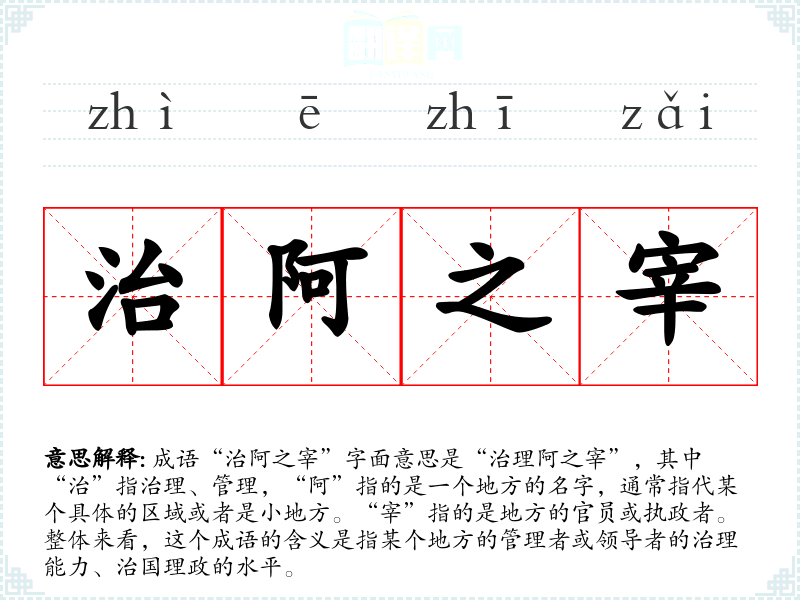 成语“治阿之宰”字面意思是“治理阿之宰”,其中“治”指治理、管理,“阿”指的是一个地方的名字,通常指代某个具体的区域或者是小地方。“宰”指的是地方的官员或执政者。整体来看,这个成语的含义是指某个地方的管理者或领导者的治理能力、治国理政的水平。