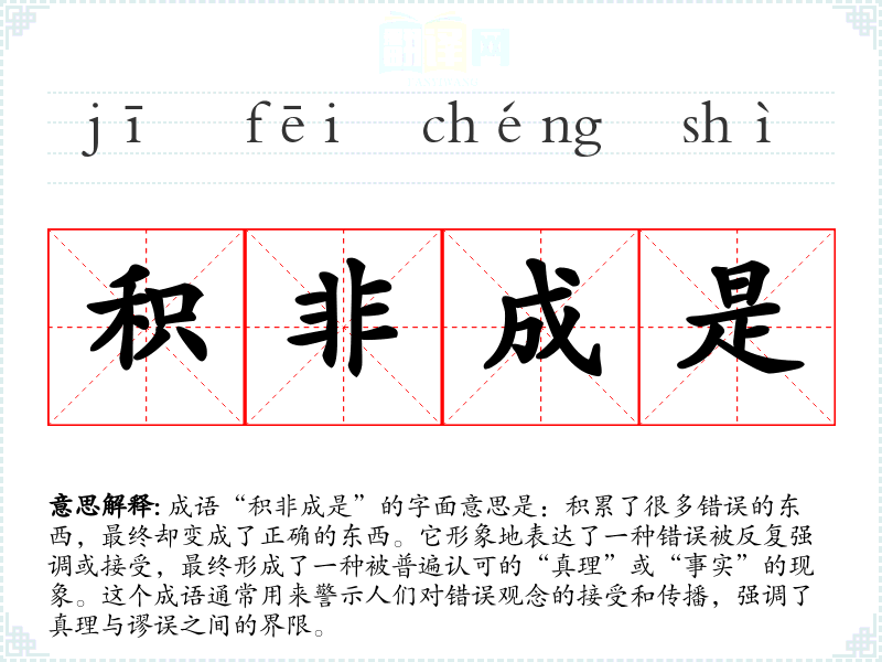 成语“积非成是”的字面意思是:积累了很多错误的东西,最终却变成了正确的东西。它形象地表达了一种错误被反复强调或接受,最终形成了一种被普遍认可的“真理”或“事实”的现象。这个成语通常用来警示人们对错误观念的接受和传播,强调了真理与谬误之间的界限。