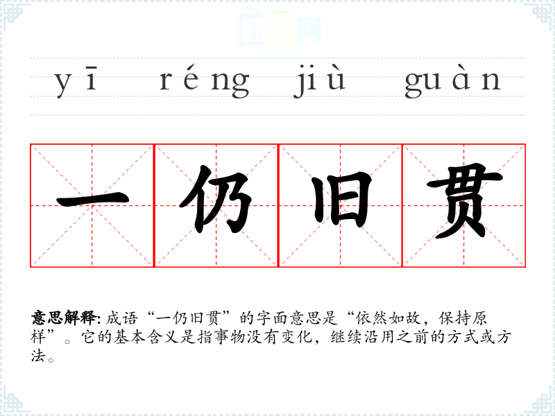 成语“一仍旧贯”的字面意思是“依然如故,保持原样”。它的基本含义是指事物没有变化,继续沿用之前的方式或方法。