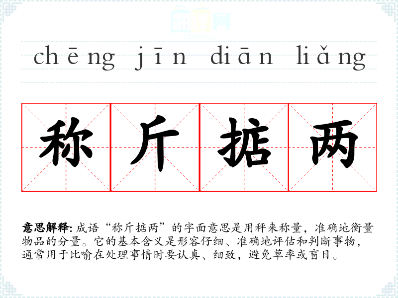 成语“称斤掂两”的字面意思是用秤来称量,准确地衡量物品的分量。它的基本含义是形容仔细、准确地评估和判断事物,通常用于比喻在处理事情时要认真、细致,避免草率或盲目。
