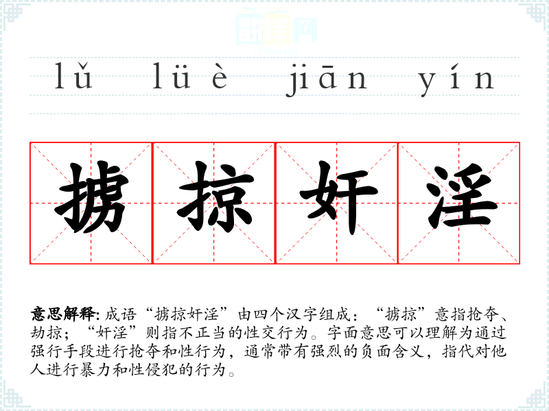 成语“掳掠奸淫”由四个汉字组成:“掳掠”意指抢夺、劫掠;“奸淫”则指不正当的性交行为。字面意思可以理解为通过强行手段进行抢夺和性行为,通常带有强烈的负面含义,指代对他人进行暴力和性侵犯的行为。