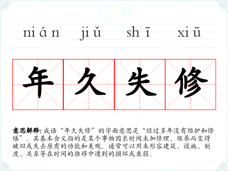 “年久失修”并没有确切的历史典故或文献出处,但可以理解为一种社会现象的反映。随着时间的推移,任何事物都需要定期的维护和修缮,以保持其正常功能和美观。因此,这个成语反映了人们对物质和制度维护的重视。