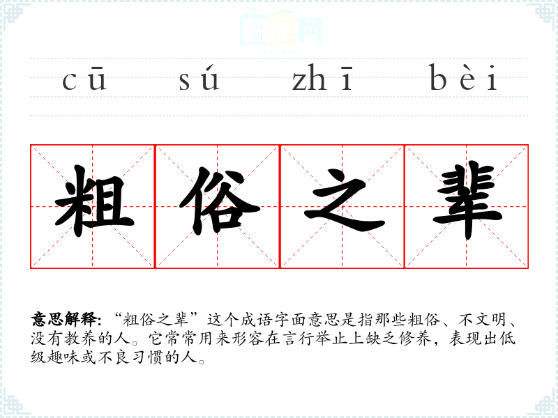 “粗俗之辈”这个成语字面意思是指那些粗俗、不文明、没有教养的人。它常常用来形容在言行举止上缺乏修养,表现出低级趣味或不良*惯的人。