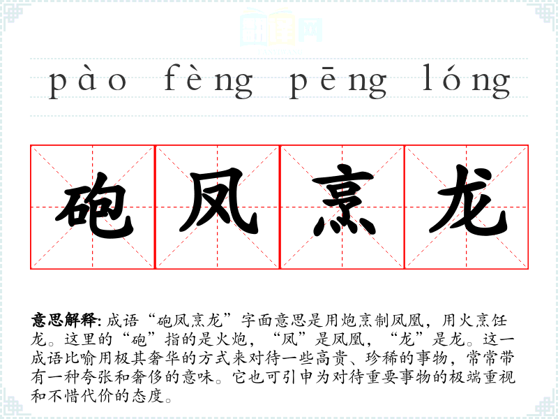 成语“砲凤烹龙”字面意思是用炮烹制凤凰,用火烹饪龙。这里的“砲”指的是火炮,“凤”是凤凰,“龙”是龙。这一成语比喻用极其奢华的方式来对待一些高贵、珍稀的事物,常常带有一种夸张和奢侈的意味。它也可引申为对待重要事物的极端重视和不惜代价的态度。