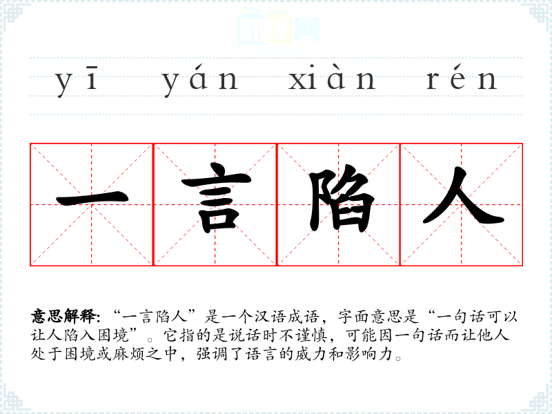 “一言陷人”是一个汉语成语,字面意思是“一句话可以让人陷入困境”。它指的是说话时不谨慎,可能因一句话而让他人处于困境或麻烦之中,强调了语言的威力和影响力。