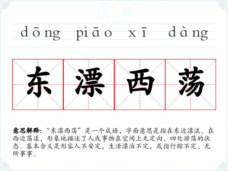 “东漂西荡”是一个成语,字面意思是指在东边漂流、在西边荡漾,形象地描述了人或事物在空间上无定向、四处游荡的状态。基本含义是形容人不安定,生活漂泊不定,或指行踪不定、无所事事。