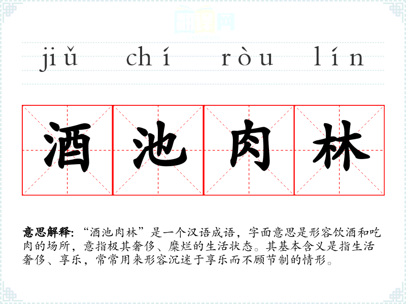 “酒池肉林”是一个汉语成语,字面意思是形容饮酒和吃肉的场所,意指极其奢侈、糜烂的生活状态。其基本含义是指生活奢侈、享乐,常常用来形容沉迷于享乐而不顾节制的情形。