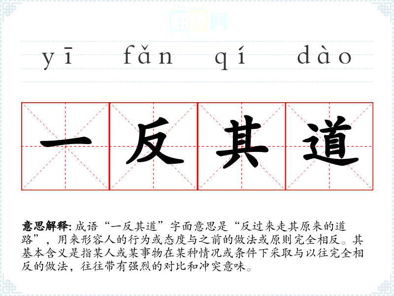 | 一反其道 | 一:整个,完全;反:相反;其:他的;道:轨道。完全与以前的轨道相反。 |