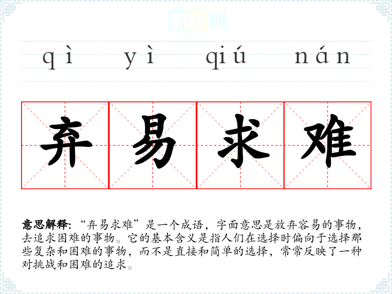 “弃易求难”是一个成语,字面意思是放弃容易的事物,去追求困难的事物。它的基本含义是指人们在选择时偏向于选择那些复杂和困难的事物,而不是直接和简单的选择,常常反映了一种对挑战和困难的追求。