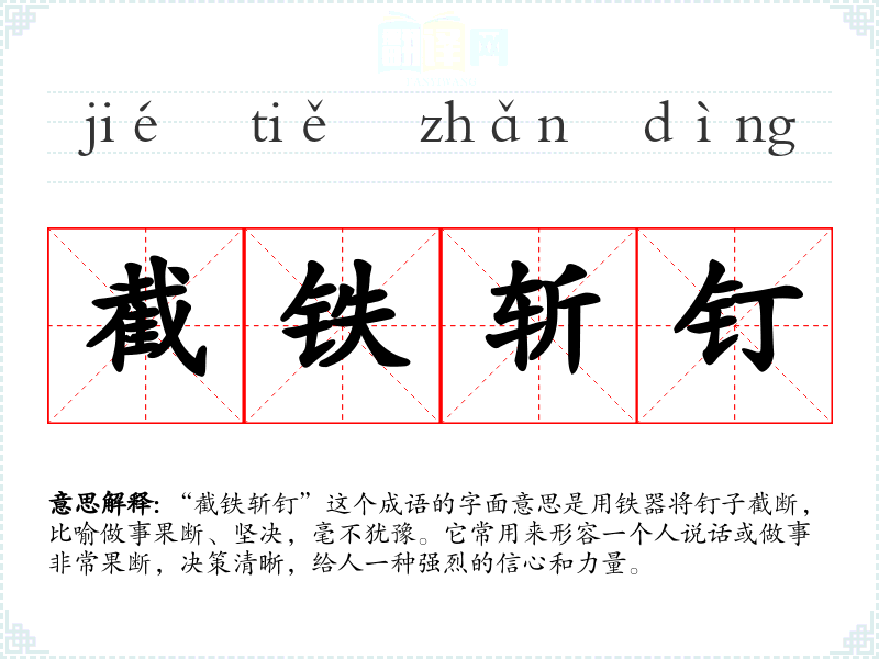 “截铁斩钉”这个成语的字面意思是用铁器将钉子截断,比喻做事果断、坚决,毫不犹豫。它常用来形容一个人说话或做事非常果断,决策清晰,给人一种强烈的信心和力量。