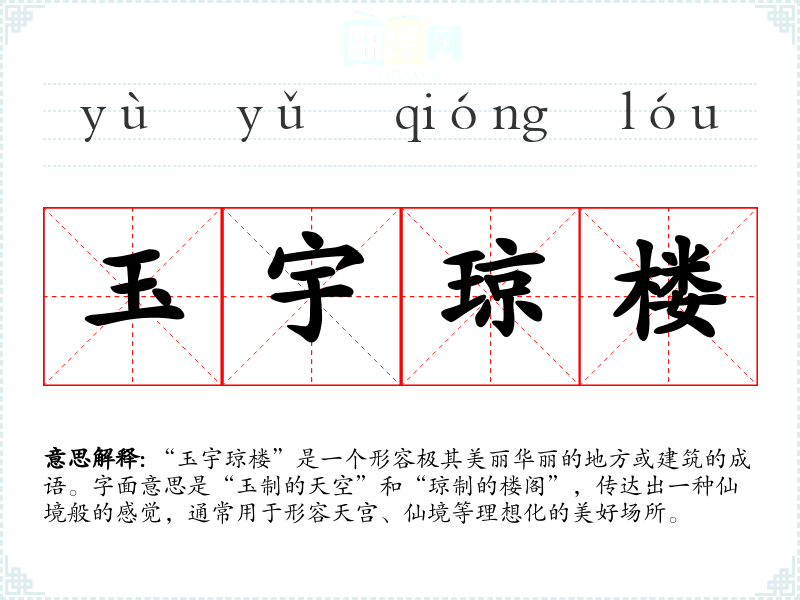 “玉宇琼楼”是一个形容极其美丽华丽的地方或建筑的成语。字面意思是“玉制的天空”和“琼制的楼阁”,传达出一种仙境般的感觉,通常用于形容天宫、仙境等理想化的美好场所。