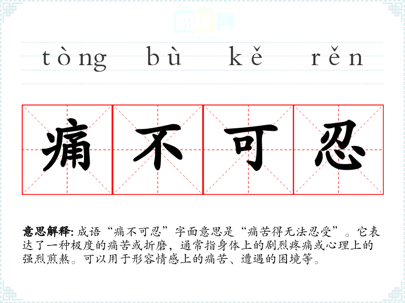 “痛不可忍”并没有特定的历史典故或文学出处,它的构成是由“痛”、“不”、“可”、“忍”四个字组成,直接反映了人们对痛苦状态的描述。该成语在古代文献中可能并不常见,但在现代汉语中被广泛使用,尤其是在形容痛苦的情境中。