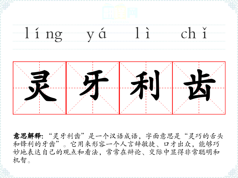 “灵牙利齿”是一个汉语成语,字面意思是“灵巧的舌头和锋利的牙齿”。它用来形容一个人言辞敏捷、口才出众,能够巧妙地表达自己的观点和看法,常常在辩论、交际中显得非常聪明和机智。