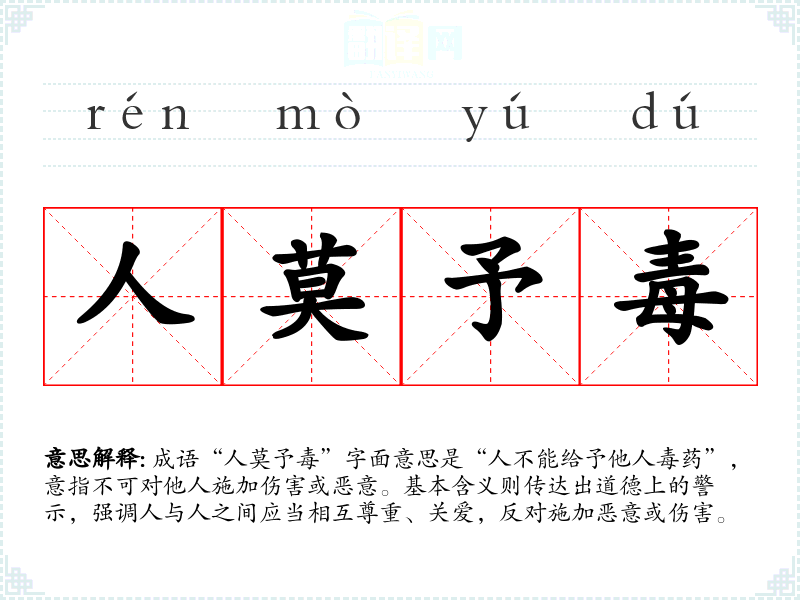 成语“人莫予毒”字面意思是“人不能给予他人毒药”,意指不可对他人施加伤害或恶意。基本含义则传达出道德上的警示,强调人与人之间应当相互尊重、关爱,反对施加恶意或伤害。