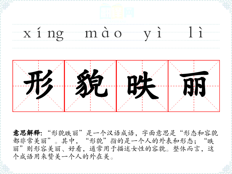 “形貌昳丽”是一个汉语成语,字面意思是“形态和容貌都非常美丽”。其中,“形貌”指的是一个人的外表和形态;“昳丽”则形容美丽、好看,通常用于描述女性的容貌。整体而言,这个成语用来赞美一个人的外在美。