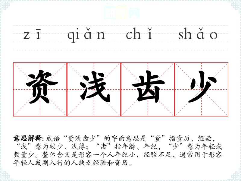成语“资浅齿少”的字面意思是“资”指资历、经验,“浅”意为较少、浅*;“齿”指年龄、年纪,“少”意为年轻或数量少。整体含义是形容一个人年纪小,经验不足,通常用于形容年轻人或刚入行的人缺乏经验和资历。