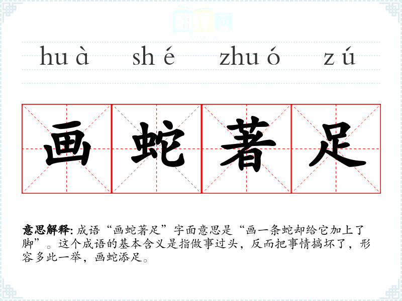 成语“画蛇著足”字面意思是“画一条蛇却给它加上了脚”。这个成语的基本含义是指做事过头,反而把事情搞坏了,形容多此一举,画蛇添足。
