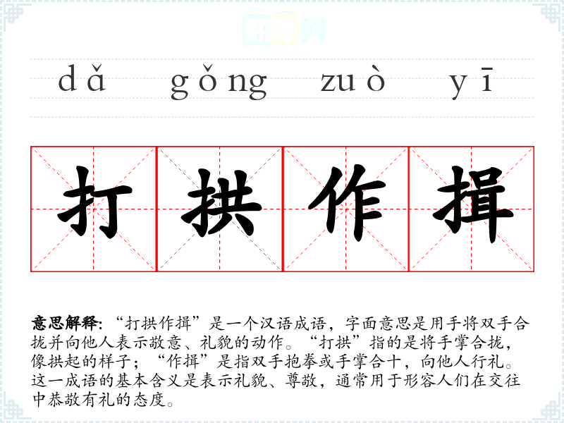 “打拱作揖”是一个汉语成语,字面意思是用手将双手合拢并向他人表示敬意、礼貌的动作。“打拱”指的是将手掌合拢,像拱起的样子;“作揖”是指双手抱拳或手掌合十,向他人行礼。这一成语的基本含义是表示礼貌、尊敬,通常用于形容人们在交往中恭敬有礼的态度。