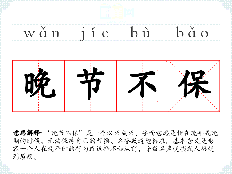 “晚节不保”是一个汉语成语,字面意思是指在晚年或晚期的时候,无法保持自己的节操、名誉或道德标准。基本含义是形容一个人在晚年时的行为或选择不如从前,导致名声受损或人格受到质疑。