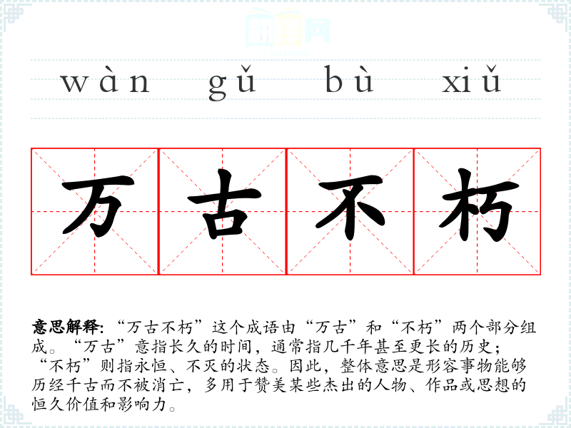 “万古不朽”这个成语由“万古”和“不朽”两个部分组成。“万古”意指长久的时间,通常指几千年甚至更长的历史;“不朽”则指永恒、不灭的状态。因此,整体意思是形容事物能够历经千古而不被消亡,多用于赞美某些杰出的人物、作品或思想的恒久价值和影响力。