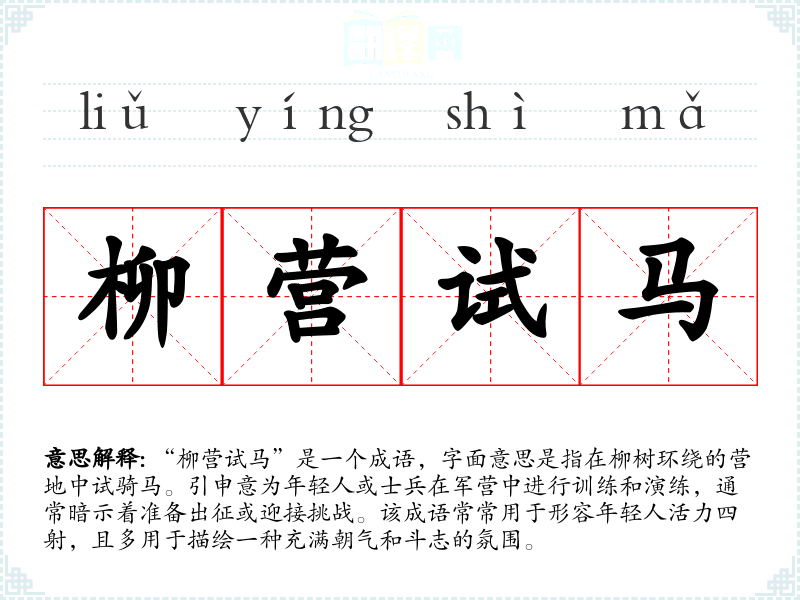“柳营试马”是一个成语,字面意思是指在柳树环绕的营地中试骑马。引申意为年轻人或士兵在军营中进行训练和演练,通常暗示着准备出征或迎接挑战。该成语常常用于形容年轻人活力四射,且多用于描绘一种充满朝气和斗志的氛围。