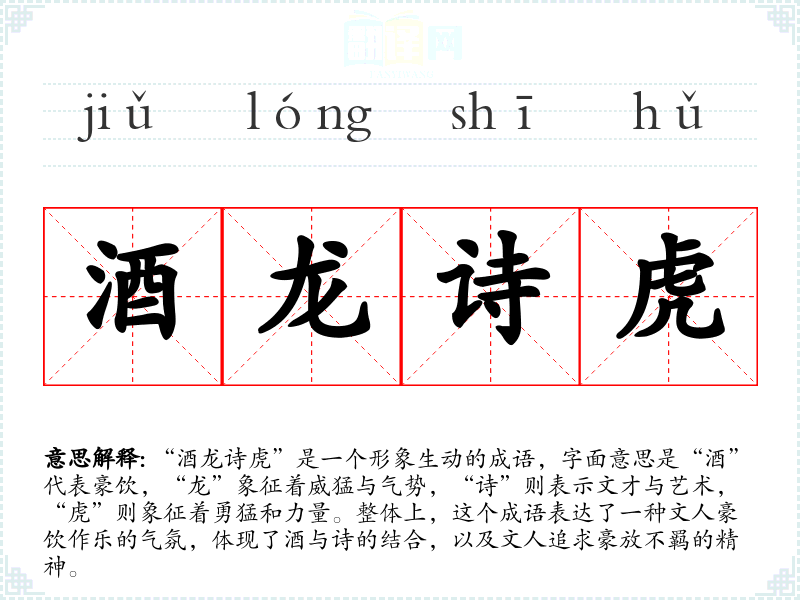 “酒龙诗虎”并没有明确的历史典故,但其字面构成可以联想到古代文人墨客的生活。**古代文人常常以酒会友,吟诗作对,酒与诗的结合象征着文人的风雅与豪情。“龙”和“虎”常被用作象征力量与气势的动物,结合在一起,进一步强调了文人的气概与风范。