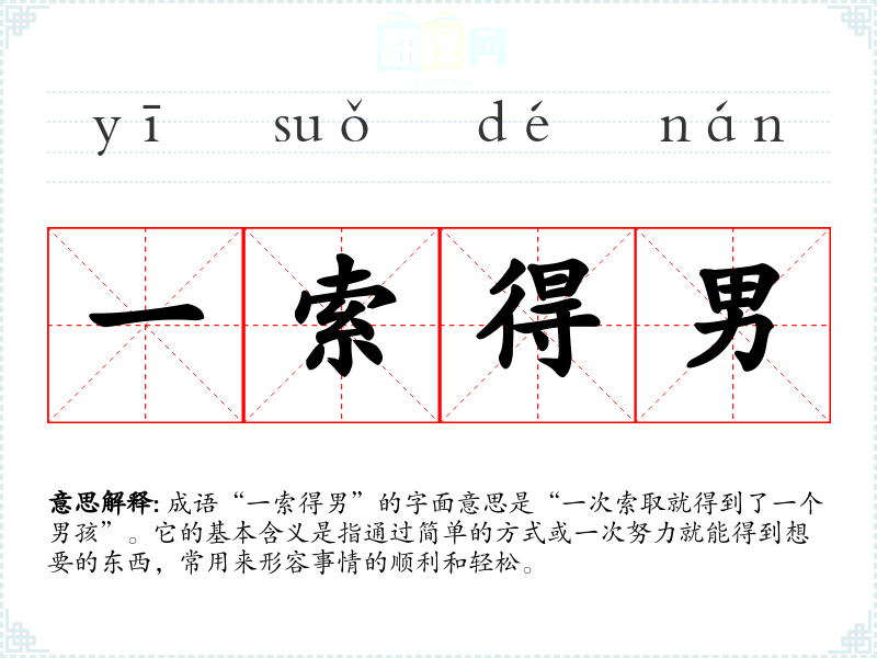 成语“一索得男”的字面意思是“一次索取就得到了一个男孩”。它的基本含义是指通过简单的方式或一次努力就能得到想要的东西,常用来形容事情的顺利和轻松。