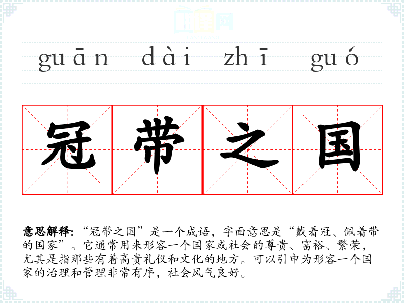 “冠带之国”是一个成语,字面意思是“戴着冠、佩着带的国家”。它通常用来形容一个国家或社会的尊贵、富裕、繁荣,尤其是指那些有着高贵礼仪和文化的地方。可以引申为形容一个国家的治理和管理非常有序,社会风气良好。