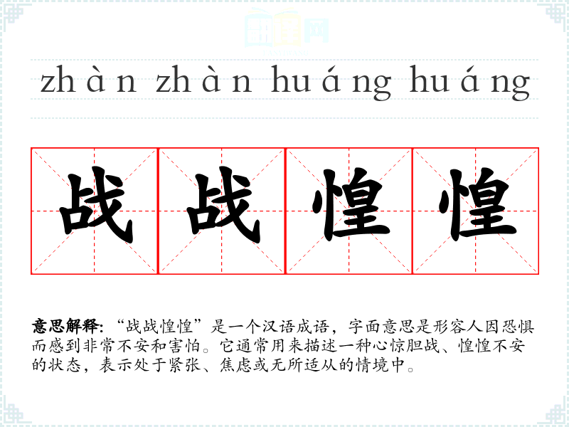 “战战惶惶”是一个汉语成语,字面意思是形容人因恐惧而感到非常不安和害怕。它通常用来描述一种心惊胆战、惶惶不安的状态,表示处于紧张、焦虑或无所适从的情境中。